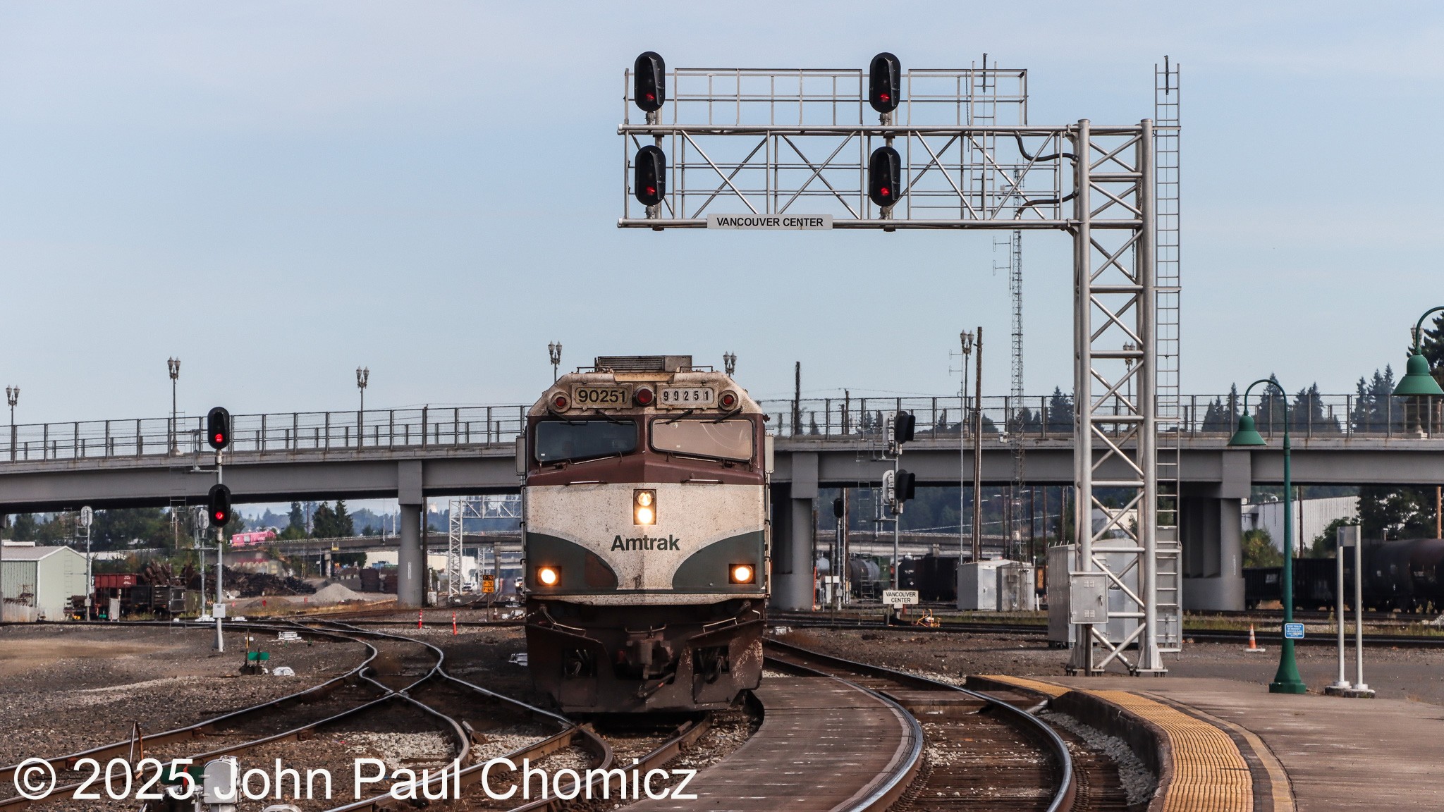 The Amtrak Cascades was definitely the most reliable train on this trip. This is the first in a series of three photos of the arrival of the Amtrak Cascades into Vancouver, WA Station on 09.08.25. After making the station stop, it will continue south towards Portland and onto Eugene, OR.