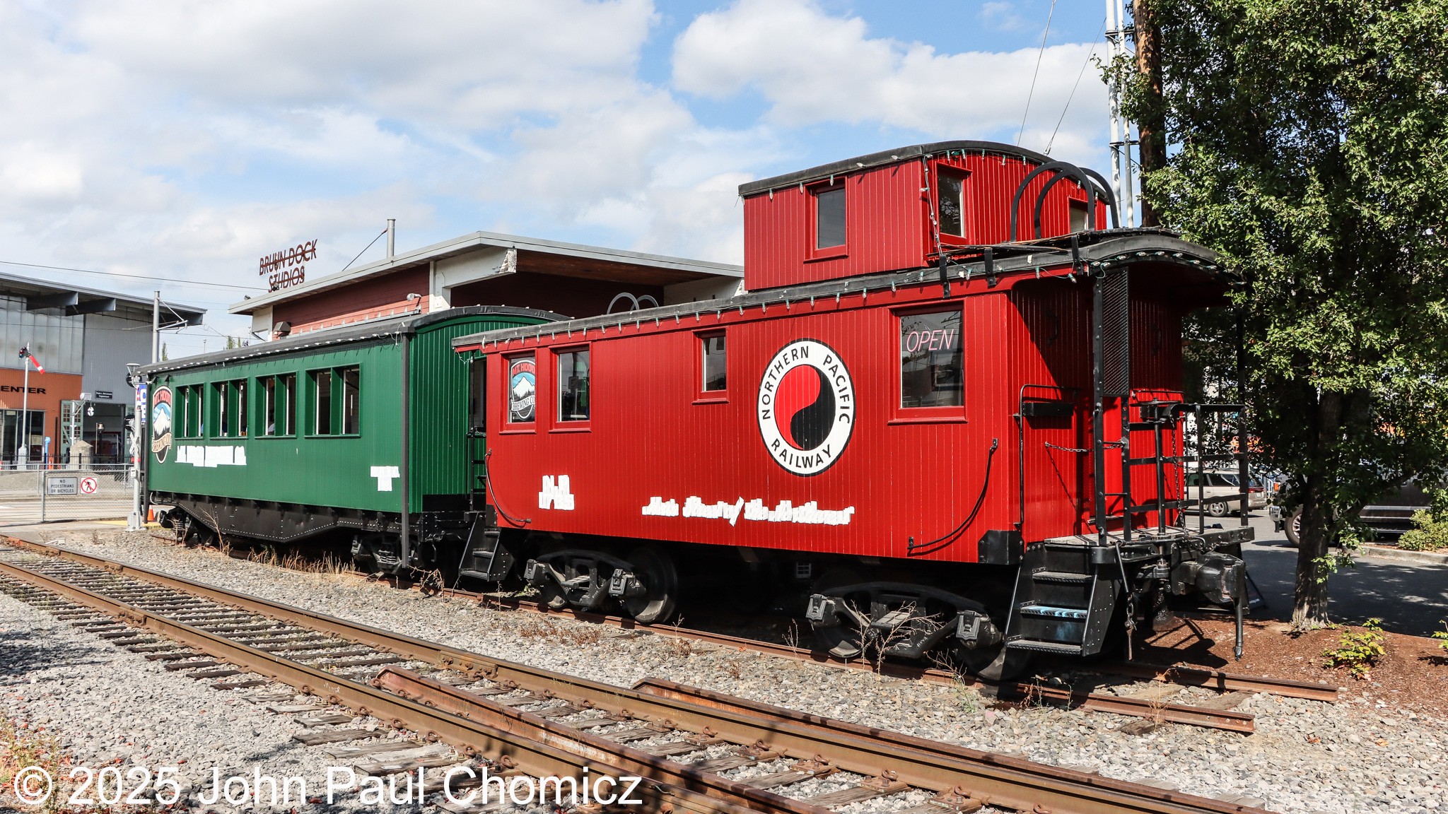 This Northern Pacific Caboose and the passenger car have been repurposed as the Mount Hood Brewing Company across from the Oregon Rail Heritage Center in Portland, OR.