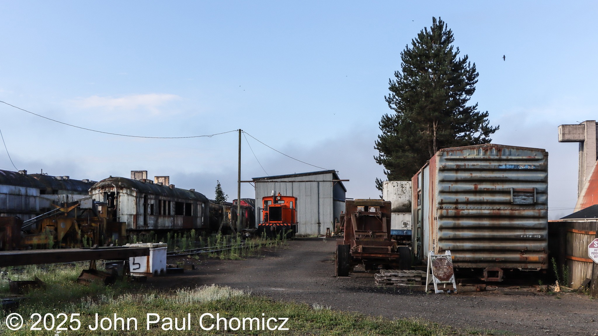 That little red GE track car is the only sign of life in this dismal scene of dead rail equipment. It provides switching services for all the equipment that will meet the end at the scrapper near the Tillamook Air Musuem in Tillamook, OR.