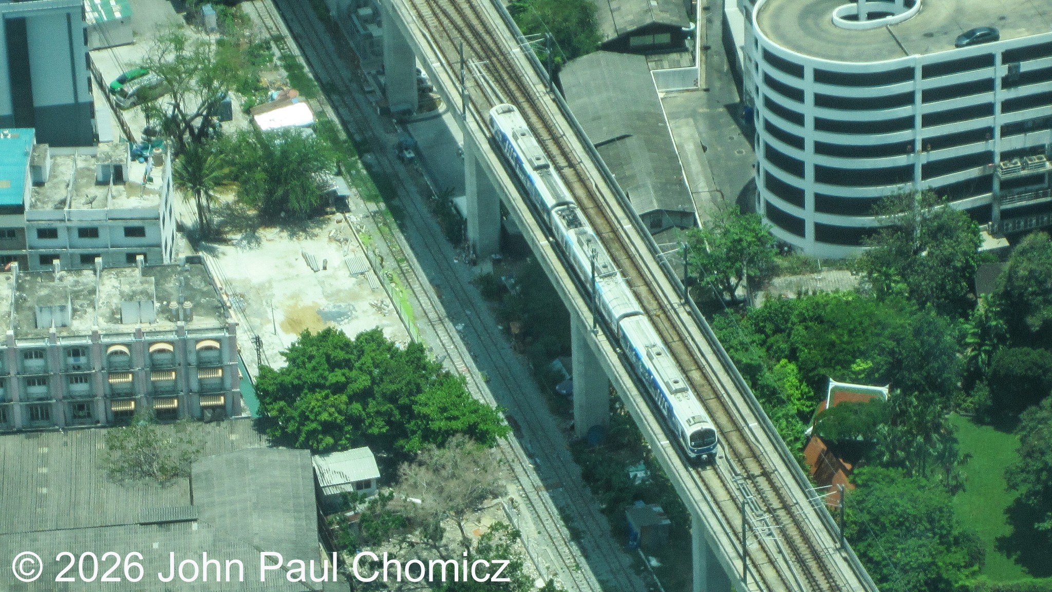 The Bangkok Metro as seen from the observation deck of the Baiyoke Sky Hotel which, at the time, was the tallest building in Bangkok, Thailand. This photo was taken in May 2014, and I believe that this was a Sukhumvit Line train that was passing way down below.