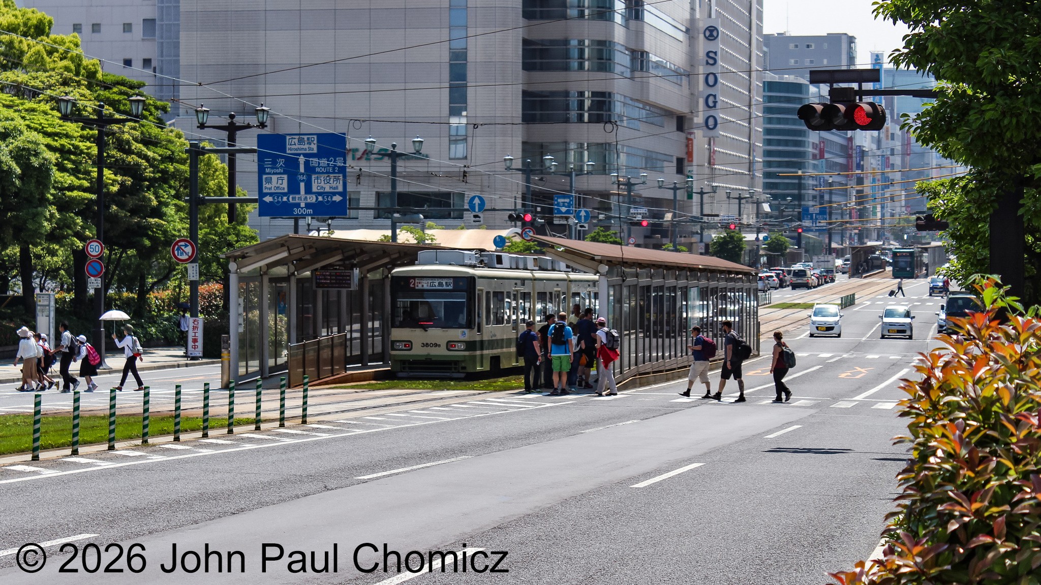 A Hiroden #: 2 line train makes a stop at Genbaku Dome-Mai Station in Hiroshima, Japan in May 2016.