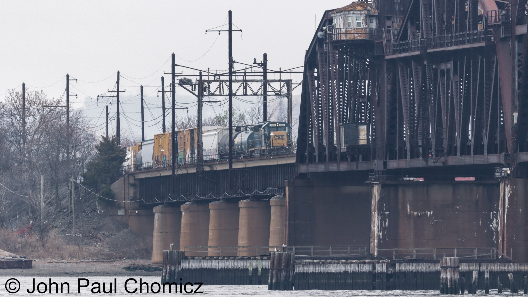 After the two other units headed to the Garden Yard, the Conrail first-trick hump job came peeking out from the bowl on this dismal, Good Friday afternoon on 04.03.26. It climbed up the hill on the east end and out onto the bridge with a cut of cars that it will shove back into the Bowl.