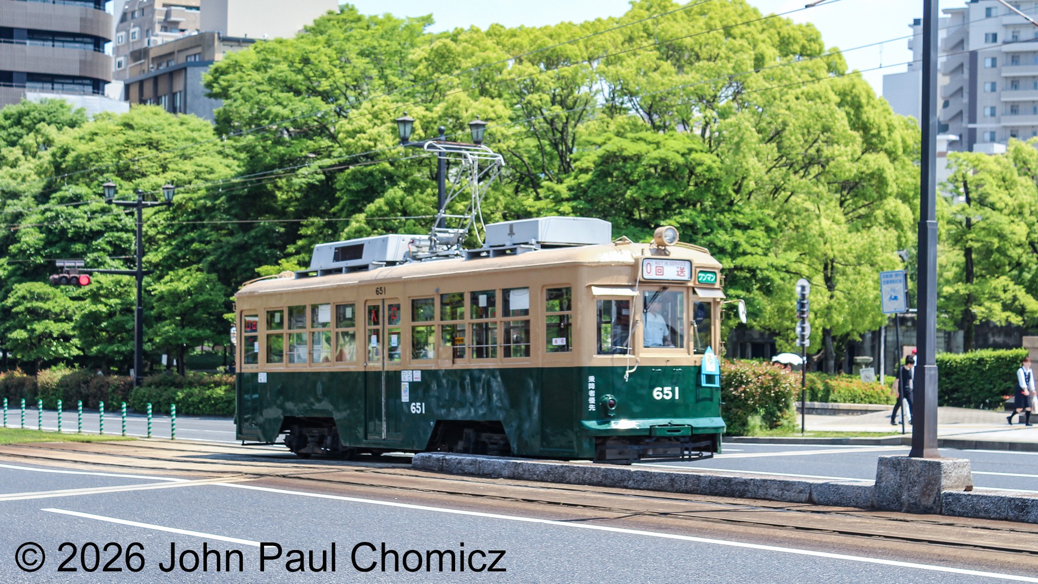We could really call this streetcar a real-life Phoenix because it rose from the ashes and rides again. Although I wasn't aware of it, during this trip, I was researching the Hiroshima Streetcars while posting the other streetcar photos and read that there were three streetcars that survived the atomic bomb. I quickly searched through my photos and, sure enough, I had a photo of the Hiroden Streetcar #: 651. This one was one of the three survivors. On August 6th, 1945, this streetcar was running a little under a half a mile from the hypocenter of the atomic bomb explosion. The explosion derailed and completely destroyed the car. All that was left was a windowless, doorless shell. Amazingly and, for reasons unknown, it along with two other units were completely restored and were back in service by March of 1946. This really is a historic streetcar and I regret not knowing this at the time and not taking a ride on it or getting a better photograph. Of course, this one was slightly blurred. I find that the setting of this photo is very appropriate as the car is about to pass over the T-Bridge which is right next to the remains of what is now known as the, "Atomic Bomb Dome", and is the biggest symbol and monument of the Hiroshima bombing. It is also about 550 feet away from the Hypocenter, as well. Much closer to where it was running the day of the bombing. There is an amazing photo of this very streetcar in Wikipedia as it looked after the bombing. Here is the link: https://en.wikipedia.org/wiki/Hiroshima_Electric_Railway#/media/File:Hiroshima_A-Bomb_Tram_651.jpg