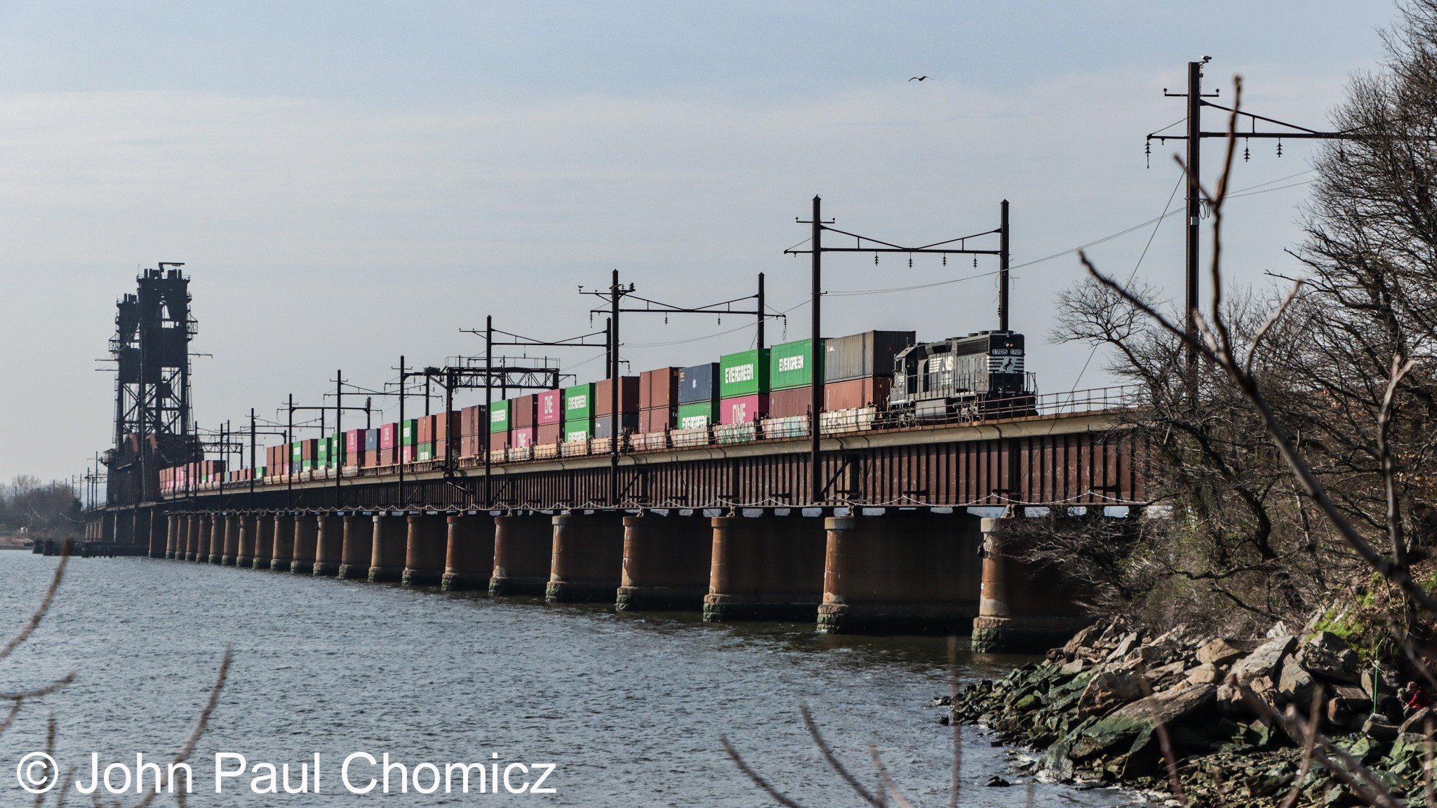 Not long after CSX Train #: M434 cleared the span, the Conrail ExpressRail Transfer headed light across the bridge to Port Newark, NJ. There, it picks up the intermodal cars destined to ExpressRail Yard at Global Container Terminals in Bayonne, NJ. Here, it is photographed on the return trip with the inbound containers for ExpressRail. Though the Bayonne Yard office has closed down and all Bayonne based operations have relocated to Greenville in Jersey City, I posted this photo in the Conrail Bayonne album because it is a Conrail local and its final destination is actually located in the extreme northeastern section of Bayonne, NJ. Although I am not sure of the actual local number, it is listed as FO-30 on the NS website, however, on the CSAO train symbol page, it is listed as YPOI-40. I also believe it is based out of Greenville and not Oak Island, though the labels haven't changed.