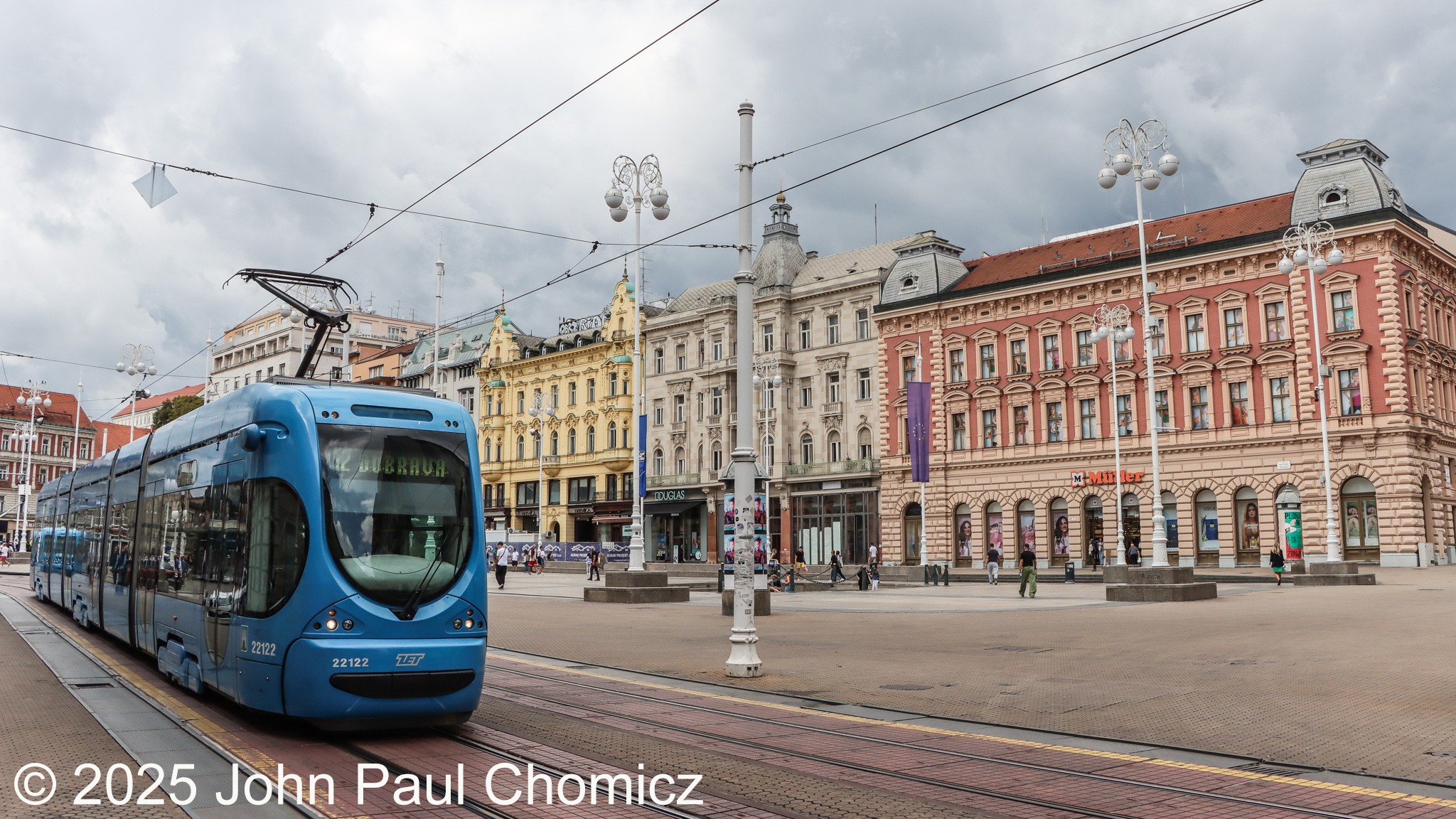 This ZET #: 12 Line tram runs through the historic Trg bana Josipa Jelačića which is the central square of Zagreb, Croatia on 08.22.25