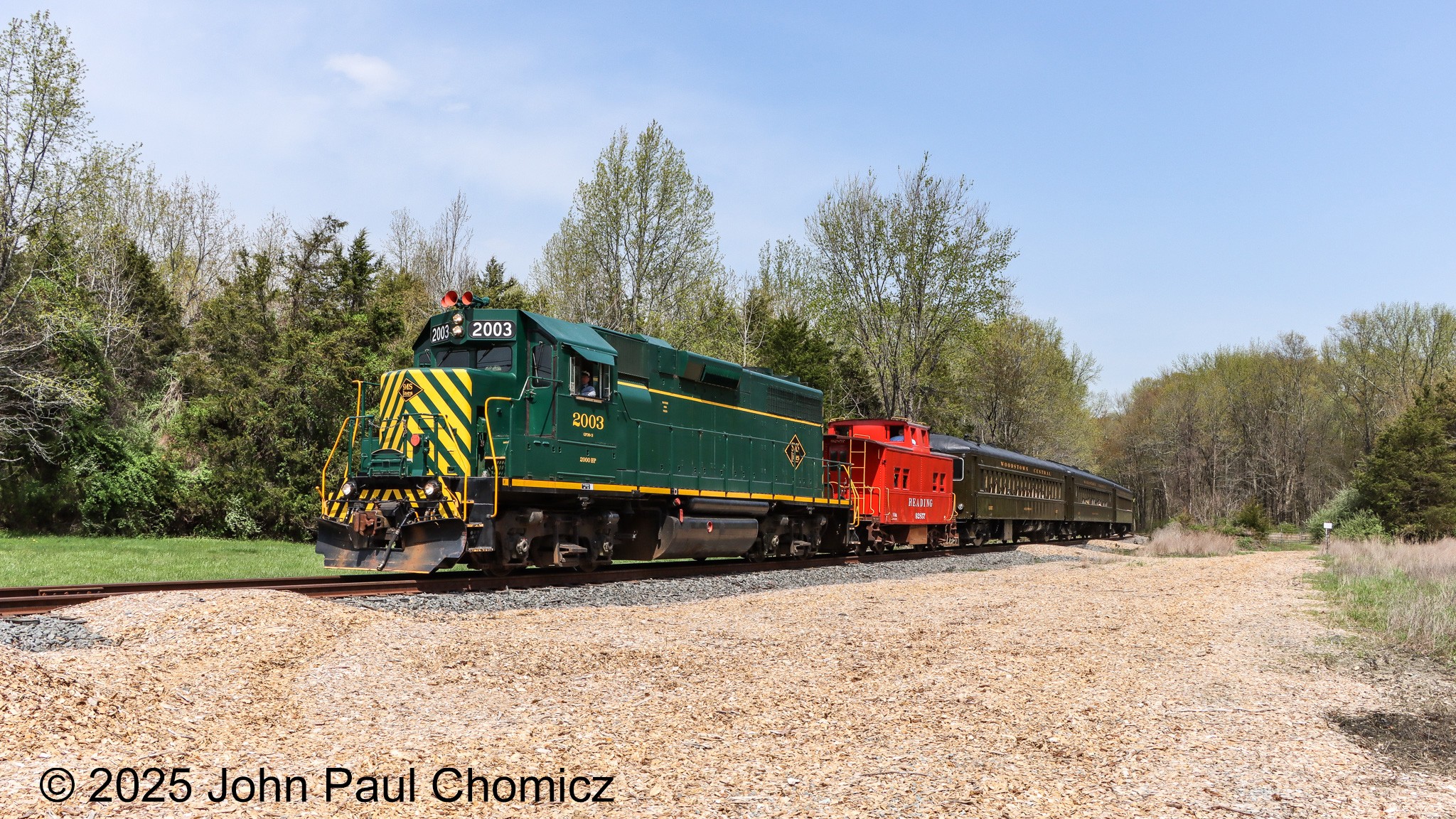 With no steam leading, the only difference between the Easter Bunny Train and the Halloween Train is the season as spring has finally sprung, as the train approaches Welchville Road in Alloway, NJ.